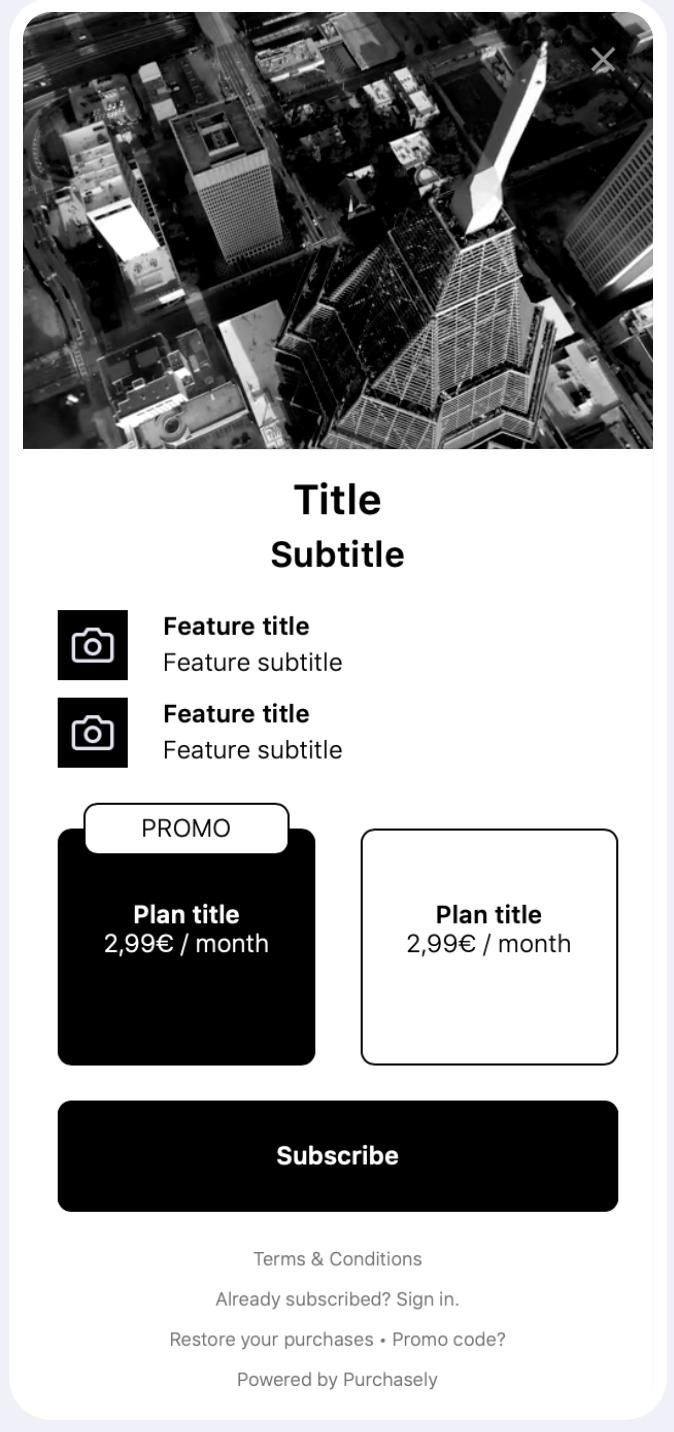 The template have 1 header, 2 features title, 2 /3 plan pickers and 1 CTA button by default.The header lets you add image or video to the paywall. You can either upload or provide link to their location.