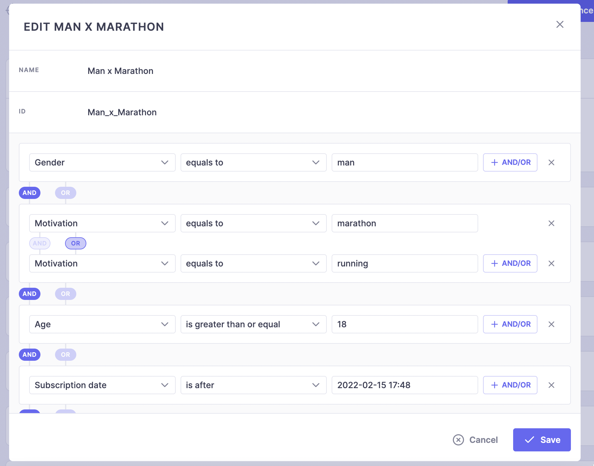 <figure><img src="https://2145676854-files.gitbook.io/~/files/v0/b/gitbook-x-prod.appspot.com/o/spaces%2FKuAJGBnHJWZbqzA4g8yO%2Fuploads%2Fgit-blob-ed84c0e665e2397c8d8887e29d34766a9d08002e%2FSCR-20220929-or3.png?alt=media" alt=""><figcaption><p>An example of an audience with a combinaison of user attributes</p></figcaption></figure>