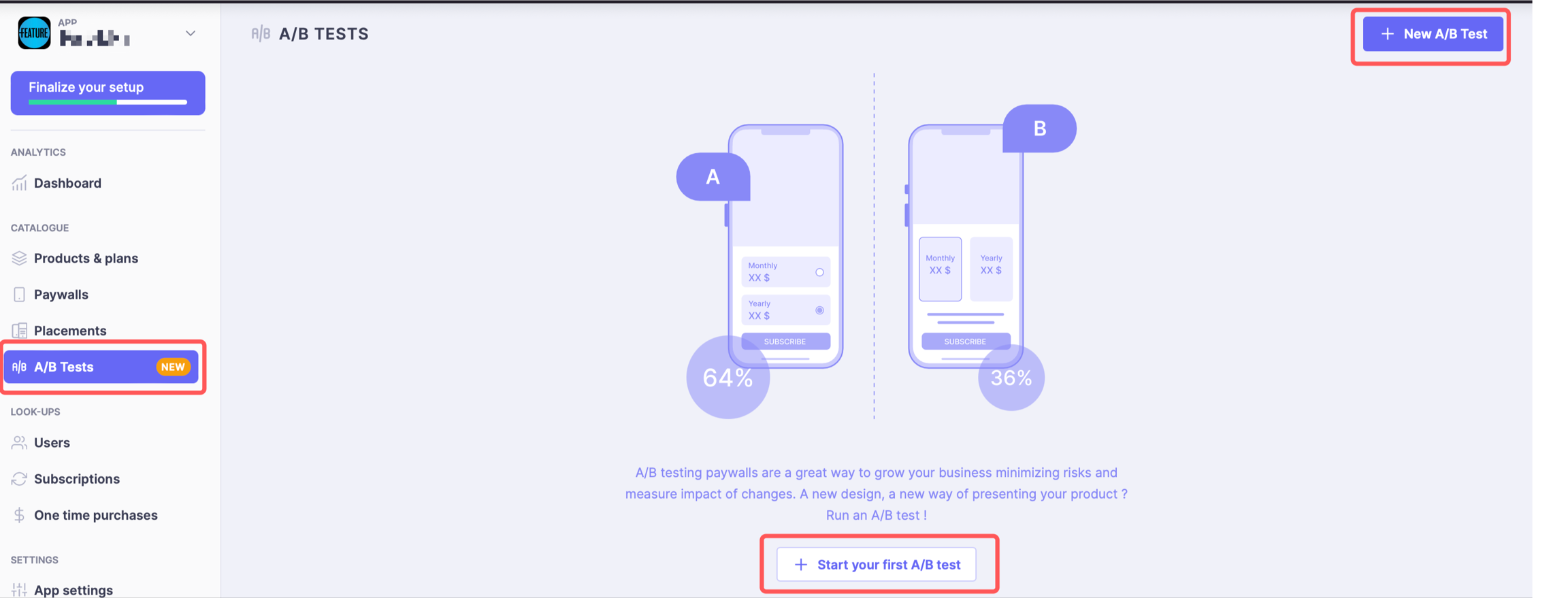 Step 1: In Purchasely Console, Click on A/B Test --> you can either click on Start your first A/B test or New A/B Test