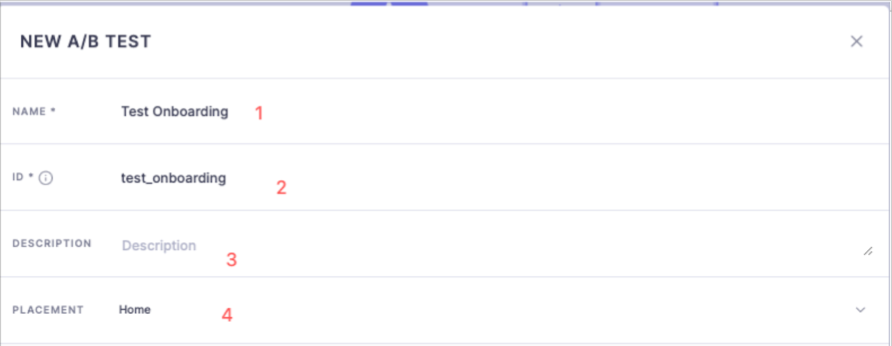 Step 2: Provide the mandatory fields- Name, ID, and Placement. You can add a short description of the A/B test created.