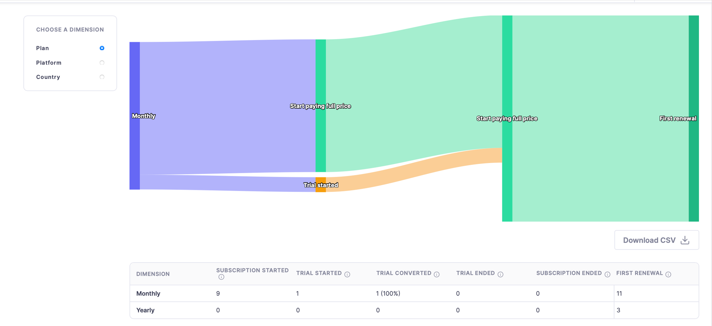 Subscription Started- the total number of users who started their subscription with the regular price( Do not include the free trial or intro price)