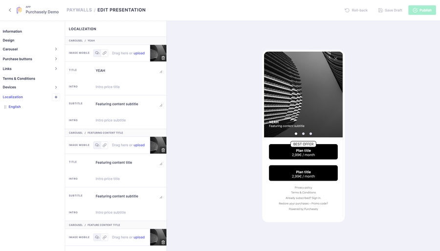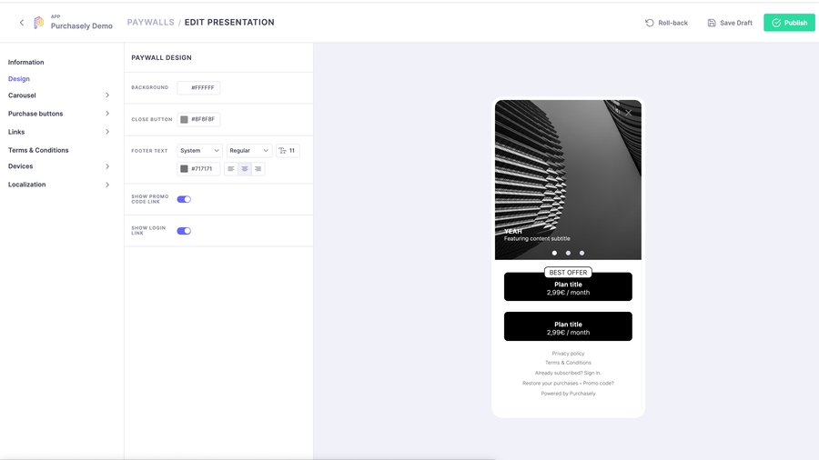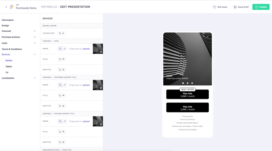Our new Paywall Builder has been released with and improved navigation to ease the set-up. It also includes the opportunity to upload device specific image to improve the experience for your users.